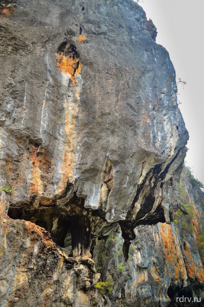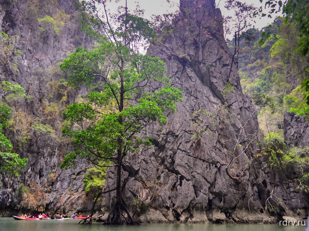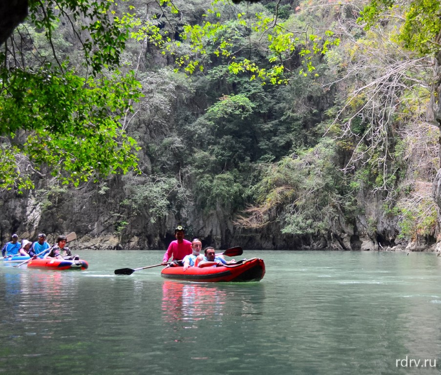 На первом острове, который называется Панак, с одного из кораблей сгрузили каноэ и тайские канойщики повезли нас в потайной ход, ведущий внутрь острова. Стоит отметить, что данный проход открывается только во время отлива. Это действительно скрытая и очень низкая и местами крайне узкая сквозная пещера.
